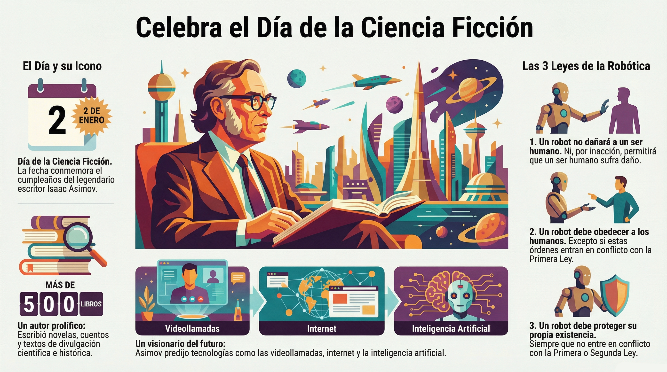 El día rinde tributo al nacimiento de Isaac Asimov, uno de los grandes padres de la ciencia ficción moderna, pero también nos invita a algo más profundo: pensar críticamente el futuro que estamos construyendo. Porque la ciencia ficción no predice el mañana; lo pone en discusión.