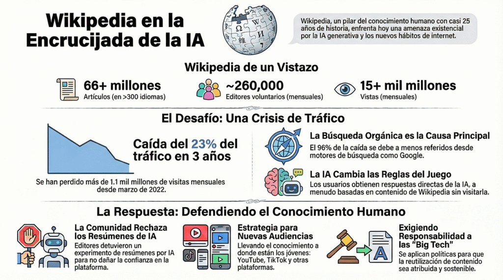 En los últimos años, Wikipedia comenzó a perder visitas. No por falta de interés, sino por un cambio profundo en cómo buscamos información. Entre 2022 y 2025, el tráfico global del sitio cayó de forma sostenida, con una reducción de más de mil millones de visitas mensuales.